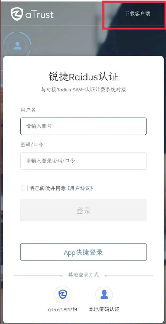 方法二:外网登录方式为打开地址:https://webvpn2.cqrk.edu.cn:10443, 先点击锐捷Raidus认证,然后使用校园网账号和密码登录